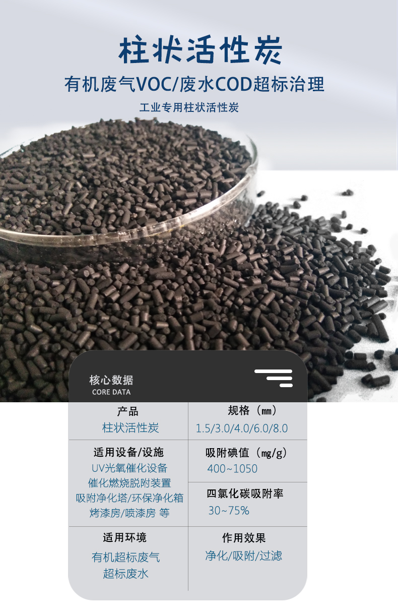 2.空氣凈化用煤質(zhì)柱狀活性炭物理性能指標有:形狀、外觀、比表面積、孔容積、比重、目數(shù)、粒度、耐磨強度、漂浮率等。