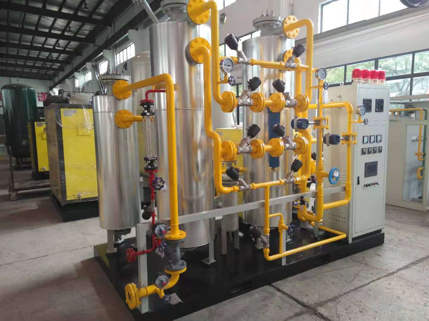 空氣壓縮機(jī)壓縮后,除塵、除油、干燥后,進(jìn)入空氣儲(chǔ)罐,通過空氣進(jìn)氣閥、左吸氣閥進(jìn)入左吸附塔,塔壓升高,壓縮空氣中的氧分子被碳分子篩吸附,未吸附氮通過吸附床,通過左吸氣閥、氮?dú)忾y進(jìn)入氮?dú)鈨?chǔ)罐,稱為左吸,持續(xù)幾十秒。食品小型制氮機(jī)。左吸過程結(jié)束后,左吸附塔與右吸附塔通過上下均壓閥連接,使兩塔壓力平衡。該過程稱為均壓,持續(xù)時(shí)間為2~3秒。均壓后,壓縮空氣通過空氣進(jìn)氣閥和右吸進(jìn)氣閥進(jìn)入右吸附塔。壓縮空氣中的氧分子被碳分子篩吸附,富氮通過右吸出氣閥和氮?dú)猱a(chǎn)氣閥進(jìn)入氮?dú)鈨?chǔ)罐。這個(gè)過程叫右吸,持續(xù)幾十秒。同時(shí),左吸附塔中碳分子篩吸附的氧氣通過左排氣閥降壓釋放回大氣中,稱為解吸。相反,左塔吸附時(shí),右塔也在解吸。為了使分子篩中降壓釋放的氧氣完全排放到大氣中,氮?dú)馔ㄟ^常開的反吹閥吹走吸附塔,將吸附塔中的氧氣吹出吸附塔。這個(gè)過程被稱為反吹,它是同時(shí)進(jìn)行的。食品級制氮機(jī)。右吸后,進(jìn)入均壓過程,然后切換到左吸過程,一直循環(huán)。