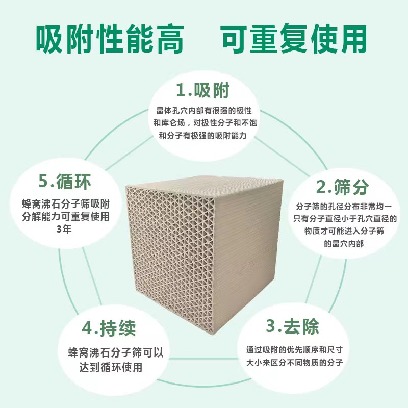 在物理化學(xué)條件下,蜂窩沸石中的孔和通道具有精確且固定的直徑。小于該直徑的物質(zhì)可以按程度吸附,而排除大于該直徑的物質(zhì),因此它們具有篩選分子的功能。