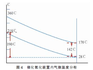 工況:入口氣體溫度T1=28 ℃,處理設(shè)備一次換熱氣體溫度T2=218 ℃,催化氧化后氣體溫度T3=360,廢氣余熱利用換熱后出口溫度T4=170 ℃。換熱溫度差值詳見(jiàn)圖4。