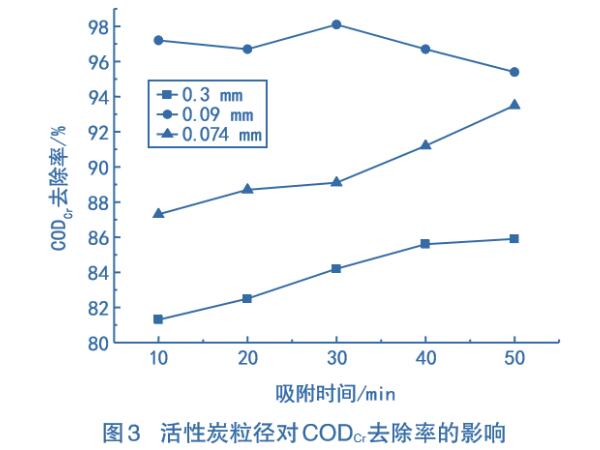 采用10g顆粒狀活性炭,粒徑分別為0.3mm、0.09mm、0.074mm的在常溫條件下吸附,測(cè)定不同吸附時(shí)間的CODcr去除率,結(jié)果如圖3所示。